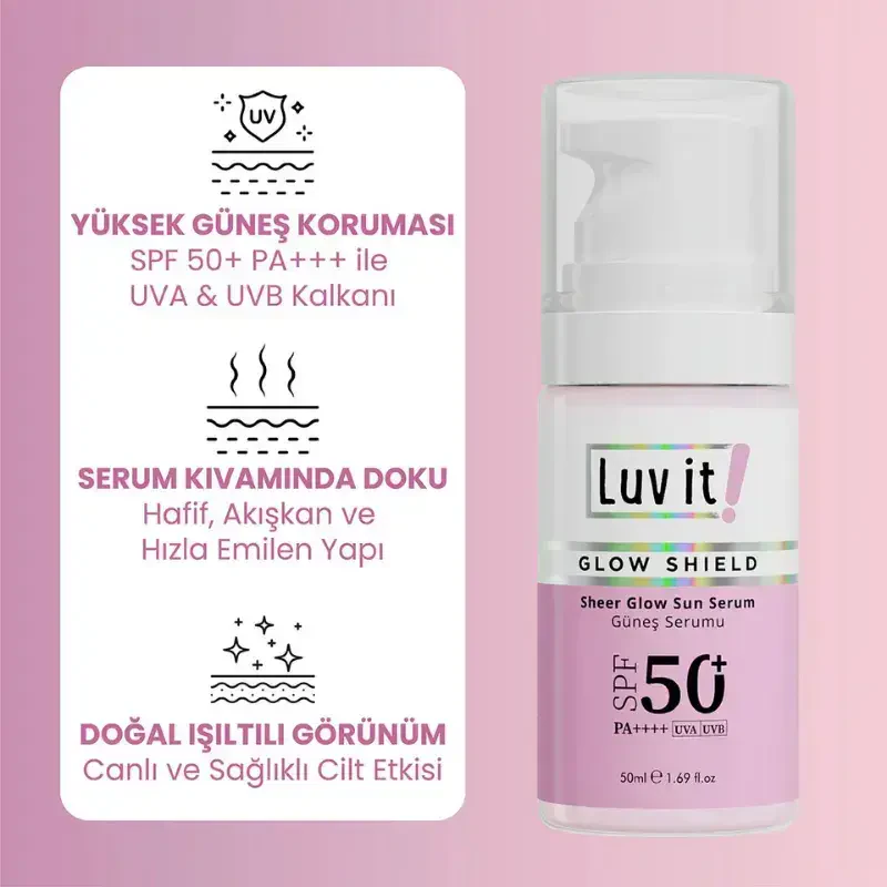 Luv it! Glow Shield Sheer Glow SPF50+ Güneş Serumu 50 ml, hem bakım hem koruma sağlayan yapısıyla cildinizi güneşe karşı güvenle korurken günlük rutininizi kolaylaştırır.