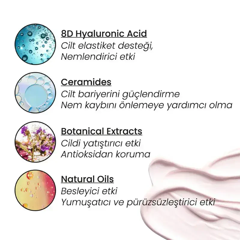 Cildi nemlendirir, besler, yatıştırır ve gün boyu süren nem desteği sağlar. Düzenli kullanımda cildin elastikiyetini artırmaya ve daha canlı bir görünüm kazanmasına yardımcı olur.